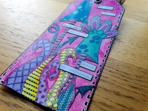 Luego, coloreé unos sellos que me mandó una amiga con los Spectrum Noir y los pegué en el tag de la forma que más me gustó.