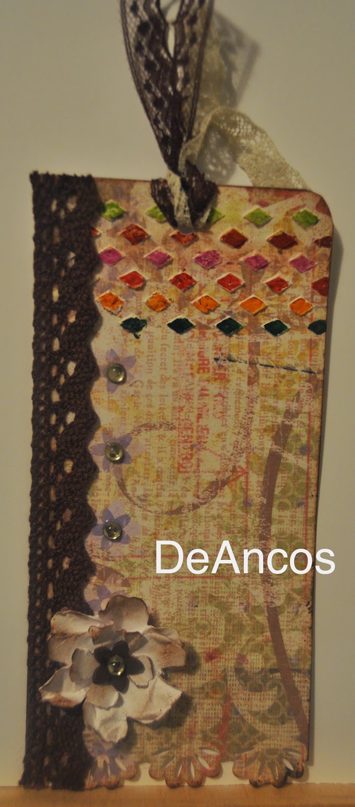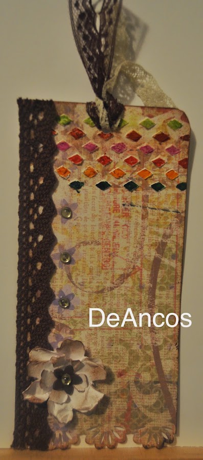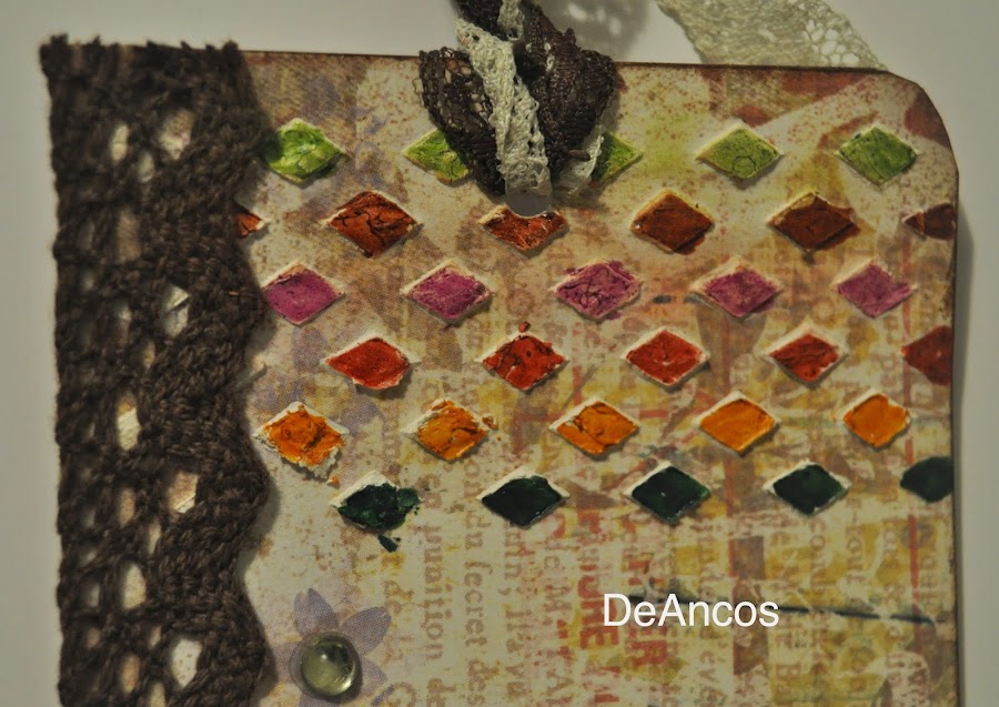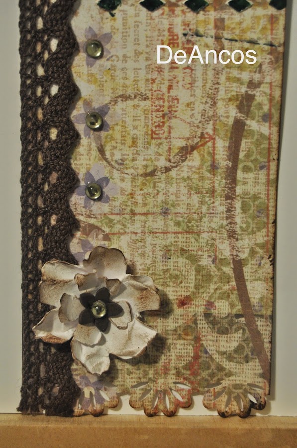 He utilizado una plantilla de rombos con pasta para relieve que he pintado con los colores del papel decorado. La lado de la puntilla adhesiva va una flor hecha por mi con el centro en goma eva marrón y un brillantito igual que los que van en el centro de las flores malvas.