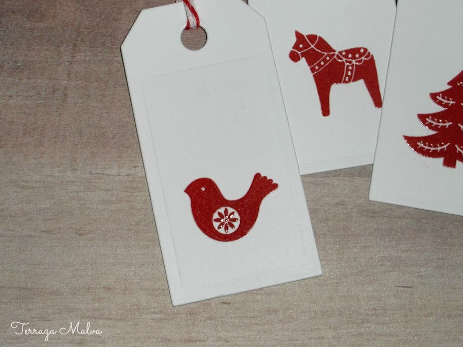 Los tags están realizados en papel acuarela grueso sobre el que he estampado los sellos con tinta roja. Después los he estampado de nuevo utilizando tinta VersaMark y he realizado un embossing con polvos transparentes. Aunque en la foto no se aprecia bien han quedado con un volumen y un brillo fantásticos.