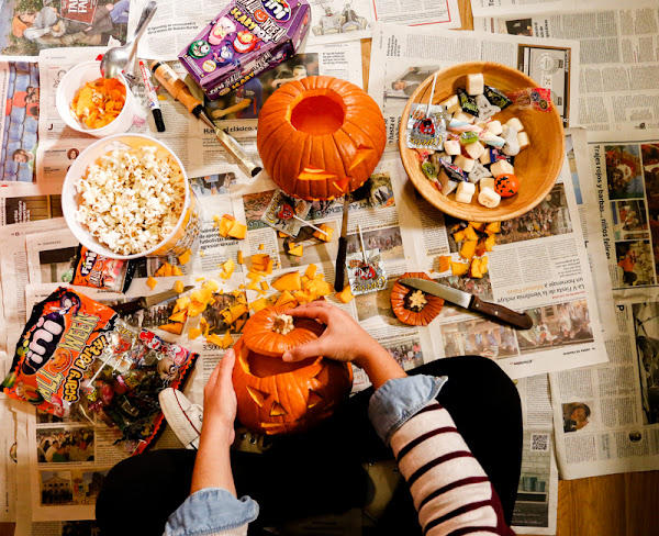 Me encanta Halloween. Es un hecho. Y si, de repente, en mi supermercado aparecen unas preciosas y redonditas calabazas listas para ser talladas... Pues lo hago. Evidentemente. Y este año he arrastrado a esta tradición a mi novio, que nunca había tallado una calabaza. Así que me planté en su casa con dos calabacitas y un montón de chuches de Halloween y así pasamos la tarde del sábado.