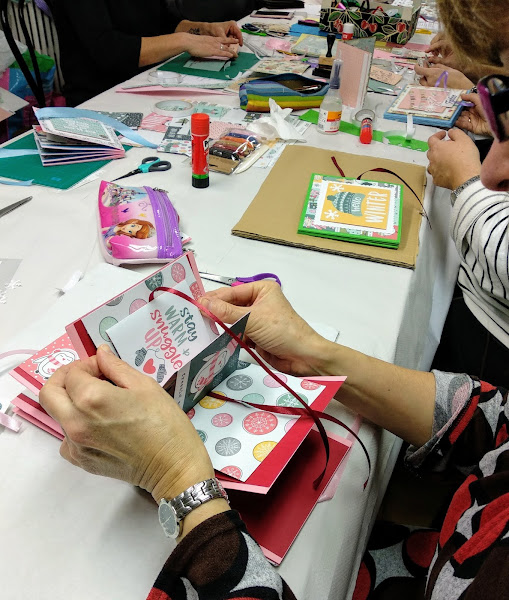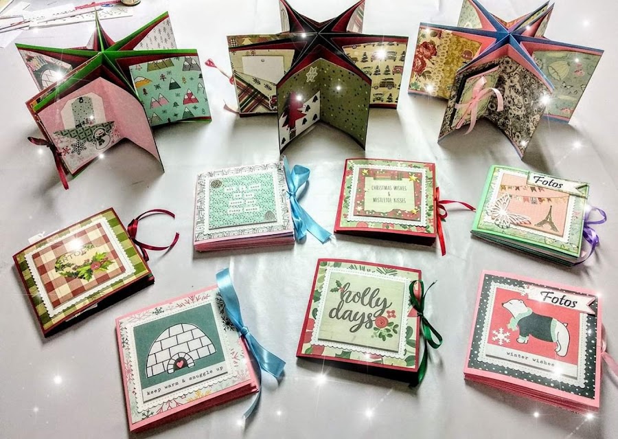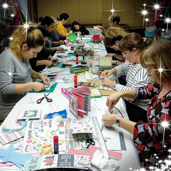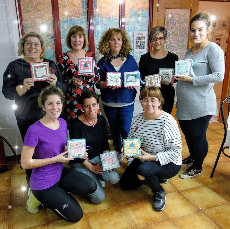 Decidimos hacer un álbum estrella con cuatro colecciones diferentes que dieron como resultados unos proyectos distintos y muy resultones. En este taller aprendieron a hacer, además de la estructura del álbum, tres tipos de bolsillos, desplegable, paisaje decor, tag... y a usar herramientas como las Corner Chomper