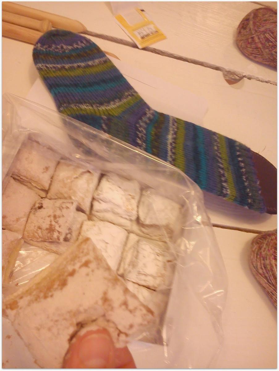 A parte de tejer el calcetín, hubo tiempo para desayunar y siempre, para charlar .Como muestra esta foto de unos maravilloso "miguelitos de crema y chocolate" que trajo Lola. ñam ñam y en otras fotos también se ven las pastitas y el té que nos puso Rosa ¡¡gracias!
