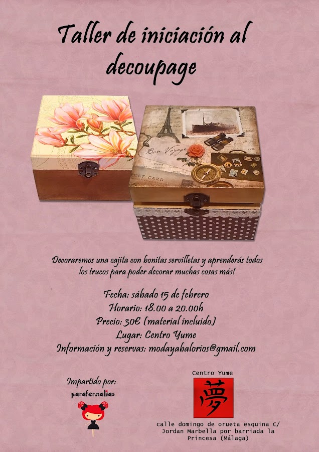 Si vives en Málaga y te apetece aprender la técnica del decoupage sobre madera, nosotros te lo ponemos fácil. Nos desplazamos al Centro Yume, ubicado en calle Domingo de Orueta (esquina con C/Jordán Marbella por la barriada la Princesa), para que no tengas que venir hasta el Rincón de la Victoria.