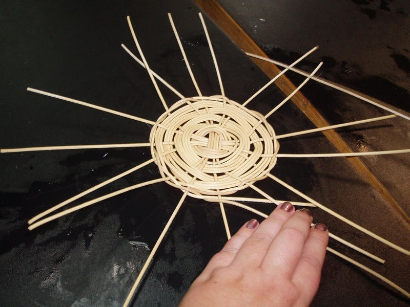 Unas vueltas más y empezamos a trabajar con las varillas de la urdimbre de forma independiente para hacer un trenzado más compacto. Si llegamos al final de la varilla con la que estamos trabajando simplemente cogemos una nueva, la entretejemos un poco y continuamos: