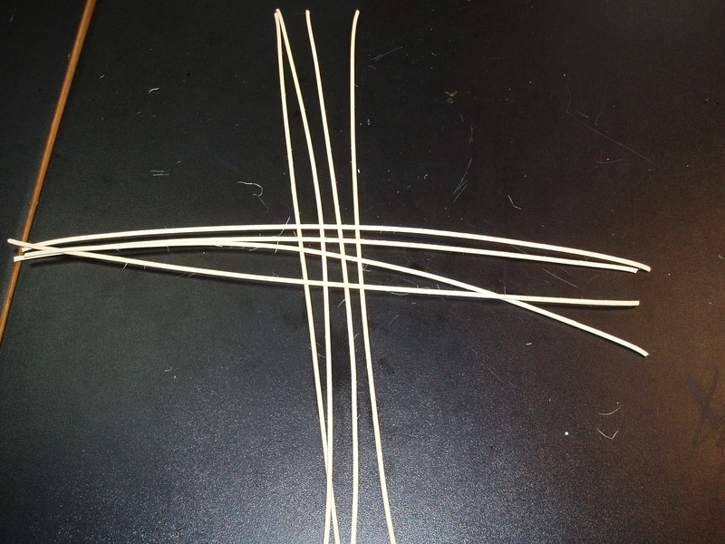 Lo primero es cortar con las tijeras una de las varillas en ocho más pequeñas y de tamaño similar, las dividimos en dos grupos y formamos una cruz, esto será la urdimbre de nuestro salvamanteles. Algo así: