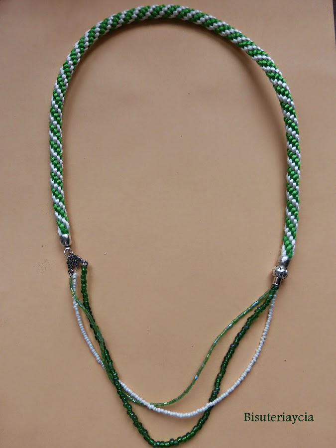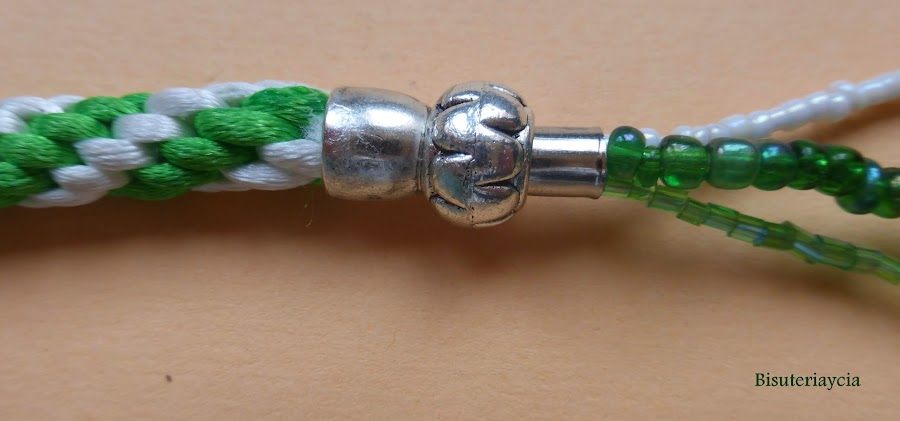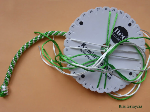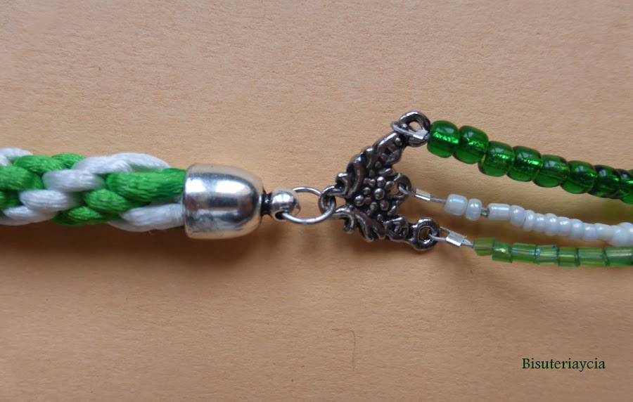 Para confeccionar la otra parte del collar decidí hacer una cordón sencillo Kumihimo. Tutorial aquí.