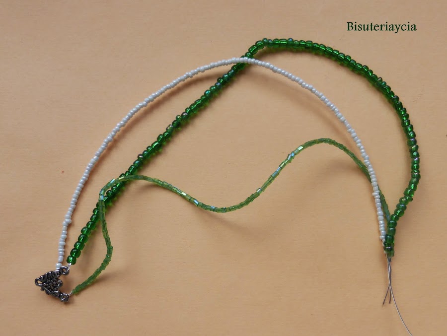 Empece atando unos alambres finos a la filigrana que formaba el pendiente y a continuación empece a enfilar rocalla verde y blanca.