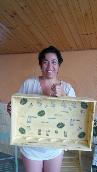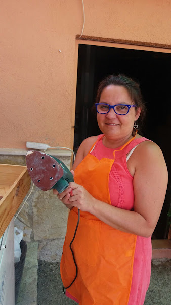 Isabel, tenía un cajón grande al que no le daba uso y estaba deteriorado, hubo que lijarlo, aquí me veis con la lijadora en mano, pero solo para hacerme la foto, fue ella quien la utilizo, sigo teniendo mucho respeto por todos estos" aparatitos"!!!
