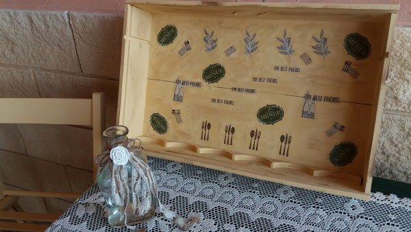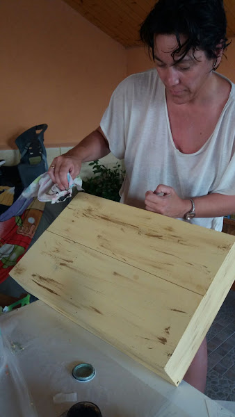 La pintó en un amarillo plátano y la envejeció con betún de Judea. Un decoupaje con una servilleta muy bonita y un estarcido con su nombre, aunque la mala calidad de la foto no deja verlo.