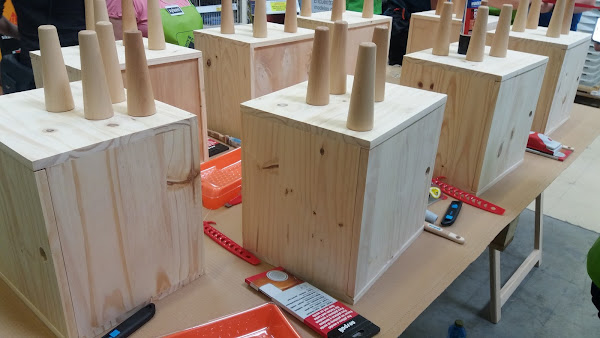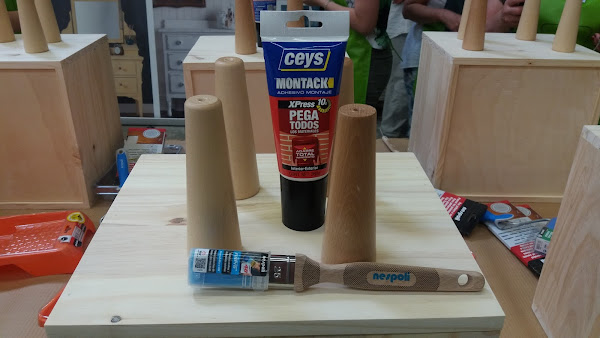 Durante el taller, lo pasamos estupendamente decorando una caja/mesita, cada una a su estilo... increíble la variedad de interpretaciones distintas de la misma caja!!! Y digo caja/mesita porque una vez terminada, le pusimos unas patitas de madera con adhesivo de montaje Montack, de Ceys.