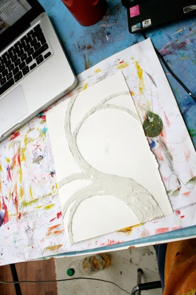 Empezamos realizando un "stencil"/ plantilla. Lo hacemos en un pedazo de cartulina, no es necesario que sea muy gruesa. Hacemos el dibujo del árbol (dejándo márgen) y luego con un bisturí (cutter) sobre una base, cortamos el árbol, para utilizar el "negativo" del dibujo, es decir la plantilla, que posicionaremos en nuestro soporte (no lo pegamos) y con cuidado esparcimos la pasta, con espátula, dándole la textura que deseemos.