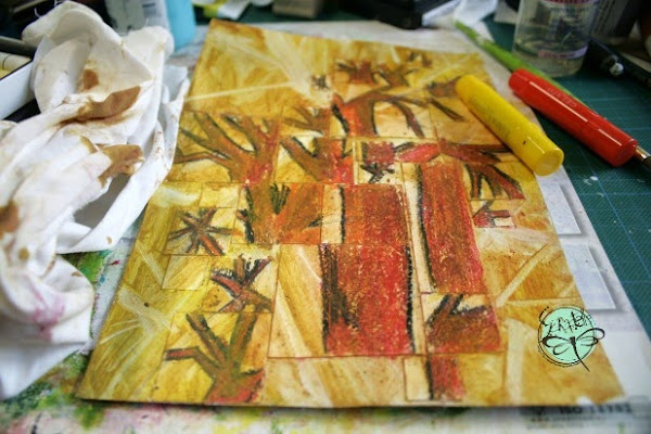 Antes de que seque, podemos quitar pigmento con un trapo, haciendo formas. En mi caso, sigo en la tónica de líneas rectas, angulosas... muy enojadas!! asi le damos "luz" a la composición.