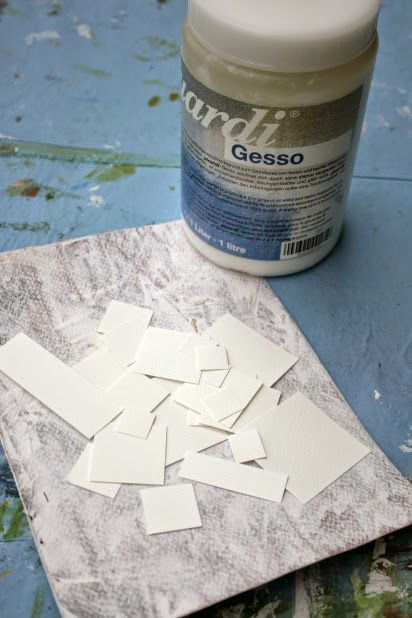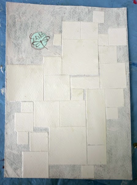 y los vamos pegando como deseémos en nuestro soporte. (en mi caso mi soporte ya tiene una capa de gesso pero no es necesario, yo tapé un color que no me gustaba) luego damos la capa de gesso a todo el conjunto. Podemos pegar los recortes en todo el espacio o sólo una parte como yo hice.