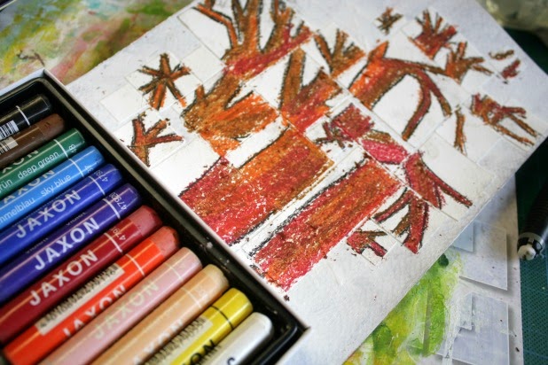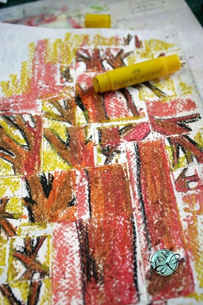 Ahora viene lo divertido: pintar! con los pasteles al óleo el área del árbol. Los crayones que usabamos en el jardin de infantes nos darán casi el mismo efecto! (y son muchiiiiisimo más baratos!)