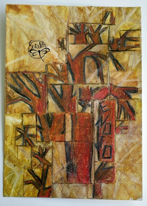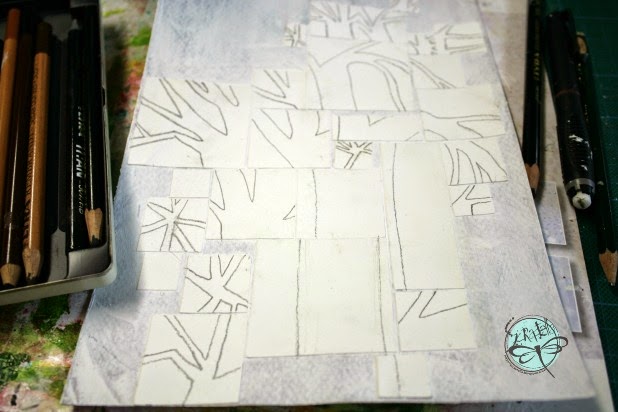 Después, debemos "fragmentar" nuestro árbol. Si les ayuda, pueden hacer el boceto y luego recortarlo en trozos... yo fui dibujando directamente mis "fragmentos". Debía ser un árbol enojado, de ahí mis trazos angulosos y con mucho negro.