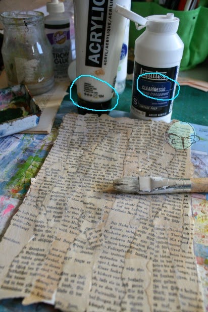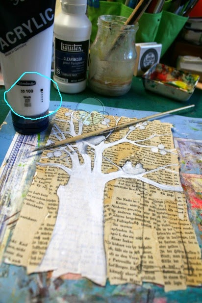 _ Podemos dar una capa muy suave de color blanco acrilico que sea transparentoso. Cómo sabemos ésto? mirando el empaque, ven en la foto? mi blanco tiene un cuadradito atravezado por una linea y esta transparente, pues es un blanco que no es cubriente. Sencillo no? si lo usamos nos quedará un poquin lechoso pero nos tapará bien los poros del papel viejo.