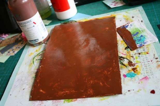 Podemos repartirla por toda nuestra base, o sólo donde deseemos craquelar. Podemos poner la pintura acrilica con un pincel, con los dedos o como en mi caso, con espátula. (véase: tarjeta)