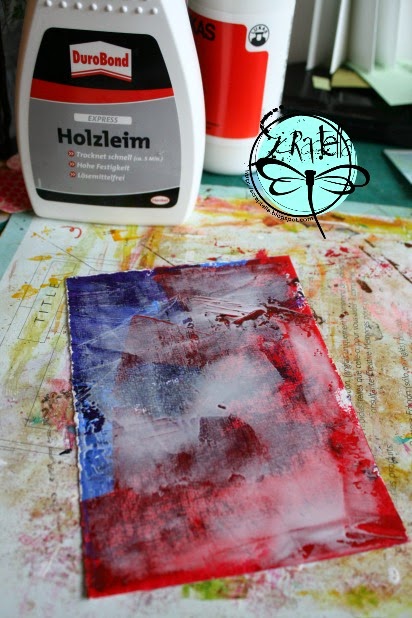 Esparcimos la cola (con los dedos o con espátula) por dónde queramos, toda la superficie o una parte... y sólo dejamos secar un poquin! ojo, la cola debe estar aún blanca (no trasparente!) y ahí le damos la otra capa de pintura, siempre en una misma dirección, yo por ejm. lo hice de arriba a abajo, es preferible hacer brochazos "gordos" y sólo una vez y no repasar por que dañamos el efecto, y dejamos secar, que la pintura se va agrietando en el proceso del secado.