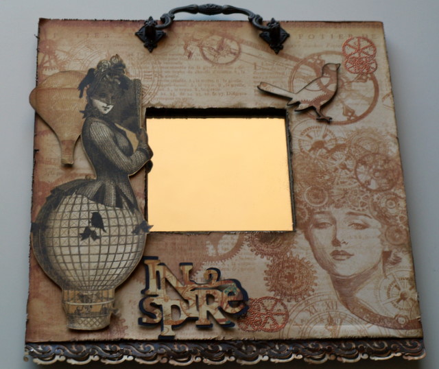 Trabajando sobre una base de madera alteraremos un espejo utilizando diferentes técnicas de scrapbooking. Usaremos papeles de la marca Graphic 45 de la colección Steampunk Debutante con los que conseguiremos un resultado con un estilo muy vintage. Listo para decorar cualquier rincón de nuestra casa.
