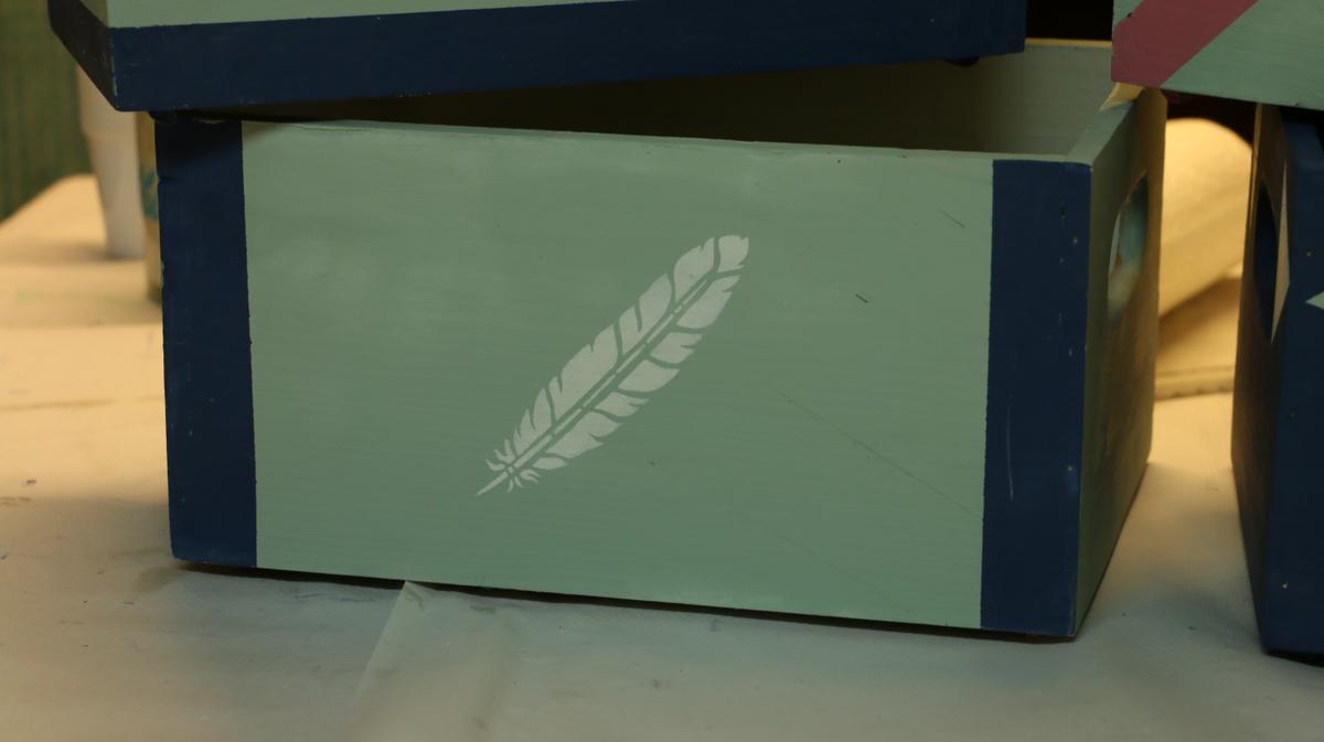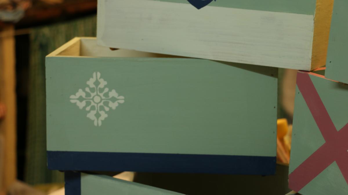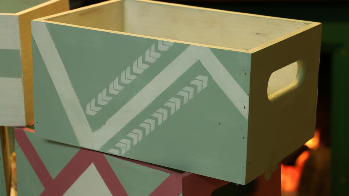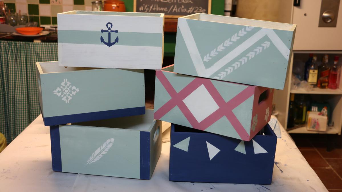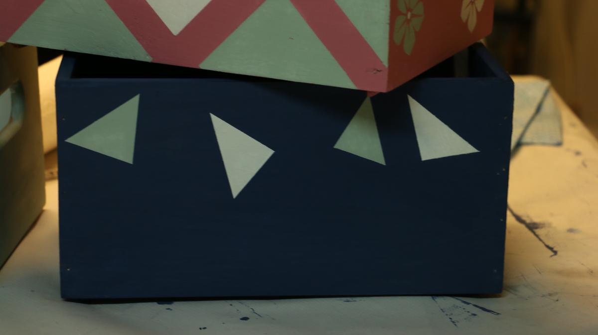 Pintamos las cajas con la Chalk Paint de Xylazel y después de las decoramos creando figuras geométricas con la cinta de papel y utilizando diferentes plantillas.