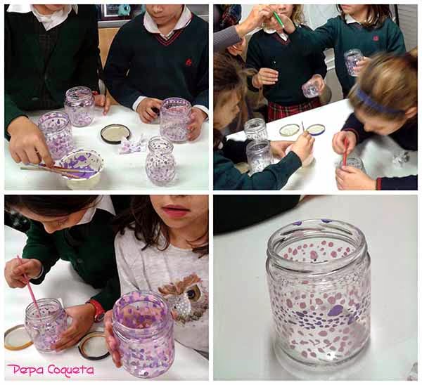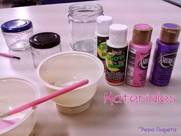 Utilizamos pocos materiales: Tarros de cristal (preferiblemente con boca ancha) pintura fosforescente, pintura de color y pinceles.