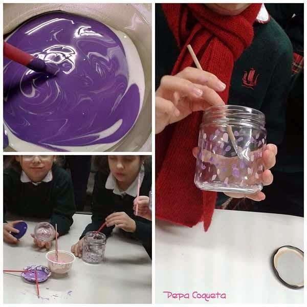 Mezclamos en igual proporción la pintura fosforescente y la de color. Nosotras utilizamos dos colores para combinar, rosa y lila. Con el pincel se empapa un poquito y se van haciendo puntitos por dentro.