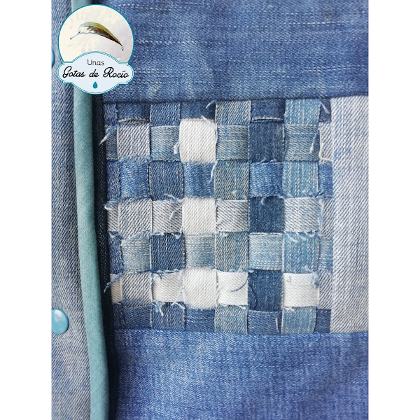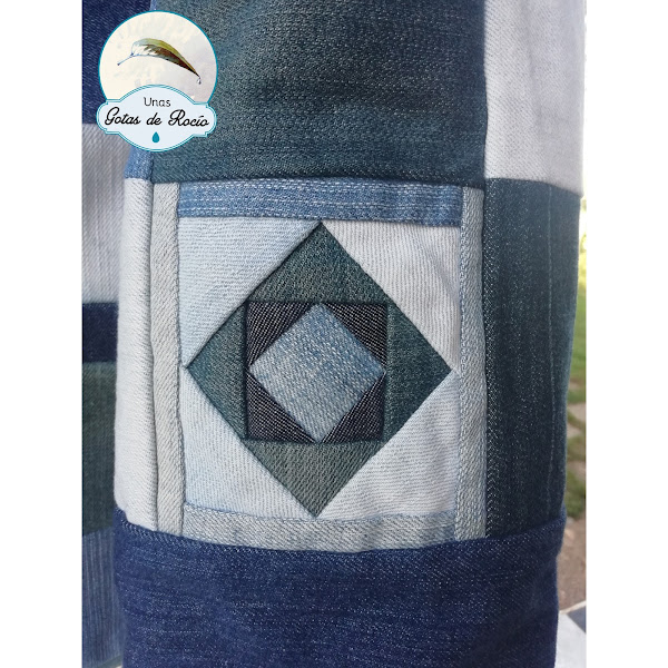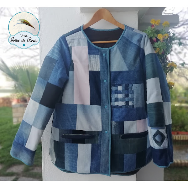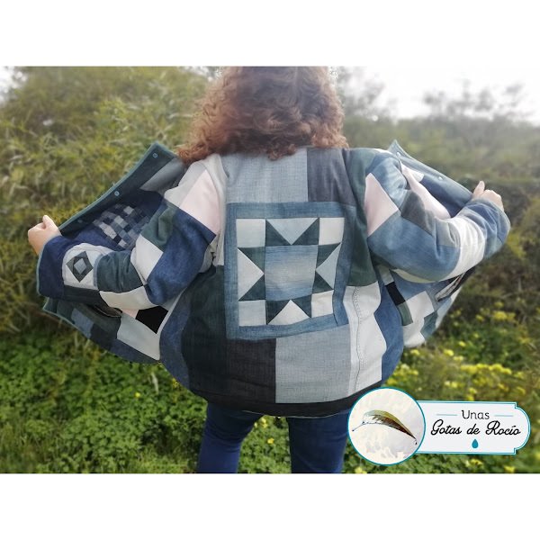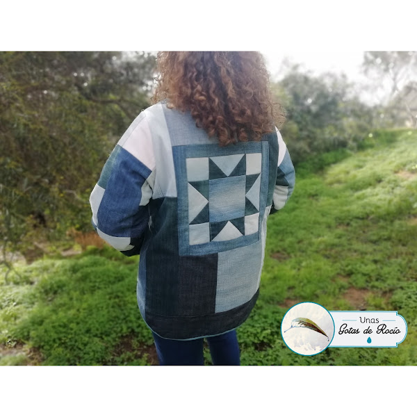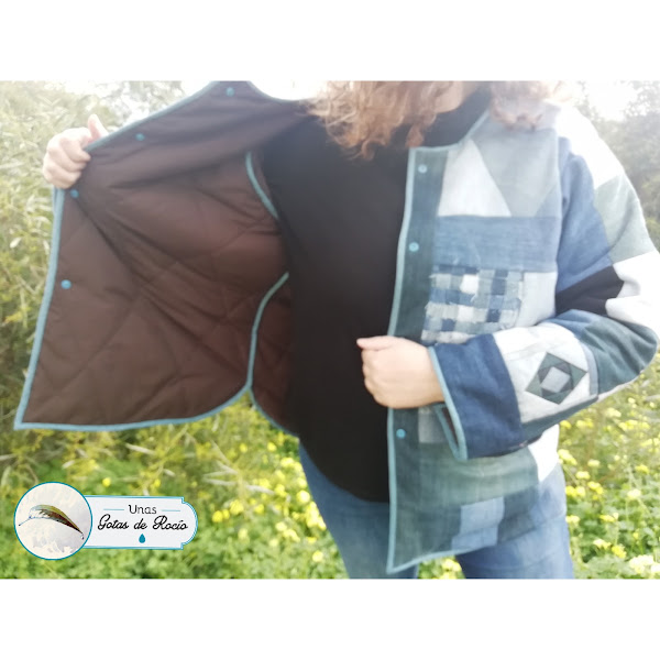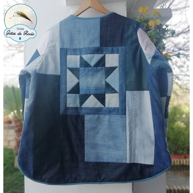 El interior va acolchado, así que es una chaqueta abrigadita. Os concreto algunos detalles más: el bies lo he preparado con una tela azul de algodón lisa, la espalda cobra protagonismo con una enorme estrella, en la manga he colocado un cuadrado dentro de cuadrado y en el delantero he incluido un meshwork. El resto son piezas geométricas cuidadosamente planificadas para que el resultado aparentemente improvisado sea casi perfecto. Y es que sí, estoy muy satisfecha con el resultado. Las intersecciones encajan tan bien que rara es la que no he conseguido unir con precisión milimétrica, lo cual con el grosor de las telas vaqueras no es nada fácil. La práctica de los años que ya llevo en estas lides es la responsable del éxito. Miro mi chaqueta y casi no me creo que yo haya hecho un trabajo así.