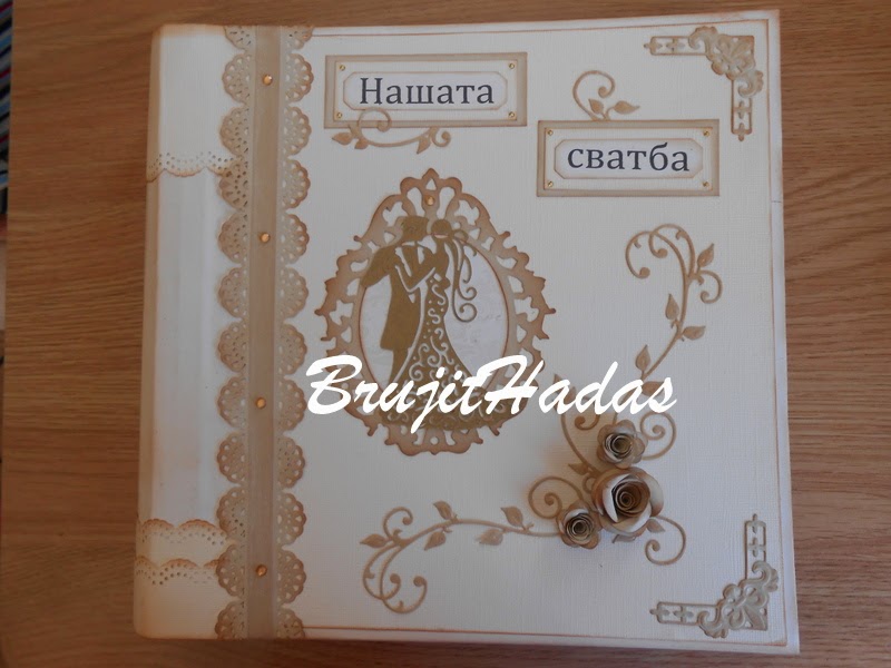 Unos novios dorados, sobre un marco en Beige....el mismo color que el resto de la decoración de la hoja. Unas hojas y unas rosa, le dan un aire distinguido...y no podían faltar los brillantitos en la cenefa.