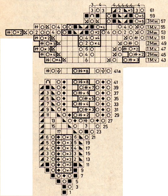 Levantar 8 p, y repartirlos en 4 agujas. En cada vuelta cerrada tejer 8 veces el fragmento del esquema gráfico.