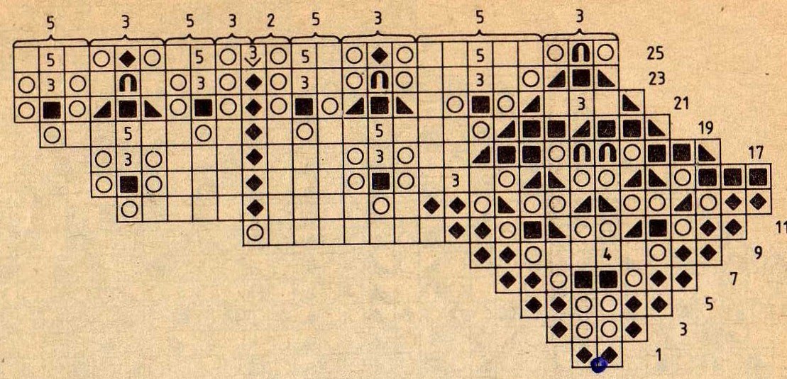 Levantar 16 puntos y repartirlos en 4 agujas. Tejer 2 vueltas cerradas al der. y luego trabajar 8 veces la muestra del esquema gráfico. Después de la 25º. vuelta cerrada, cerrar los puntos a ganchillo, intercalando 10 cadenetas respectivamente