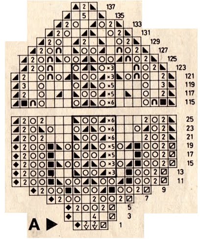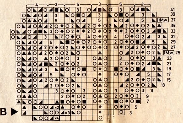 Ahora repetimos 18 veces la fase del gráfico B, tejiendo las vueltas intermedias en punto derecho.Empezar sobre el 5º punto de los 8 de la última vuelta.