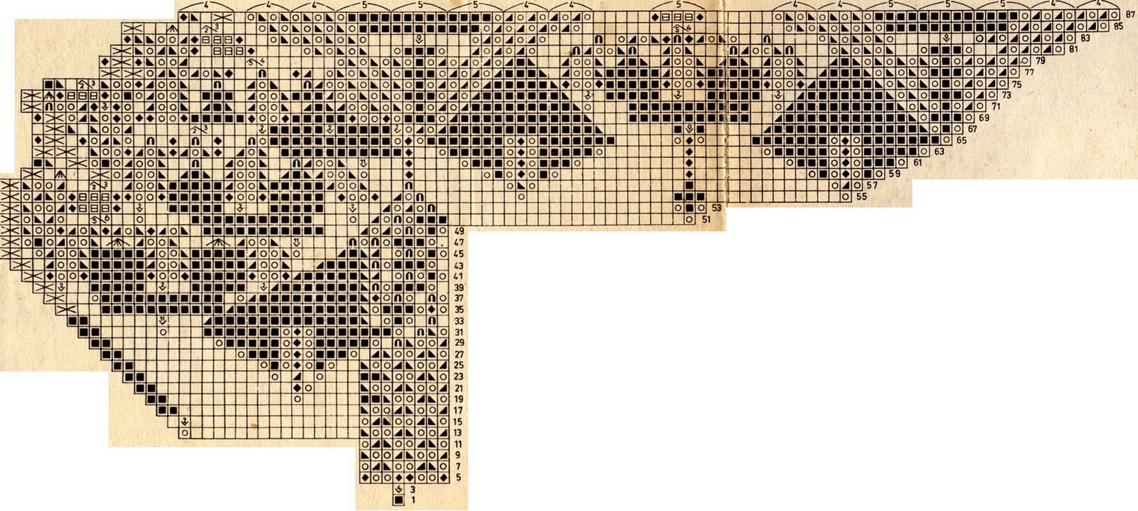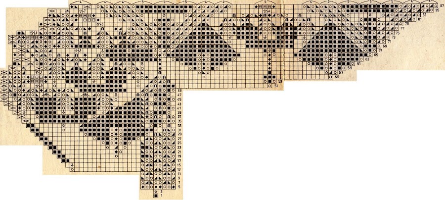 Levantar 8 p. y distribuir en 4 agujas.Seguir el diagráma gráfico, repitiendo 8 veces el esquema.