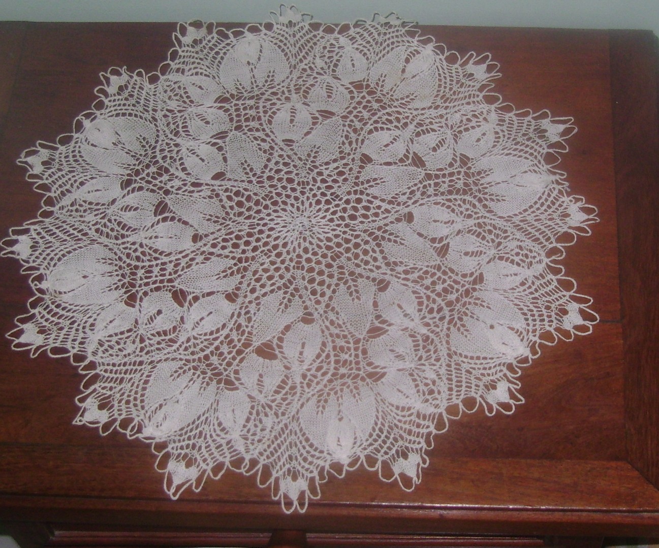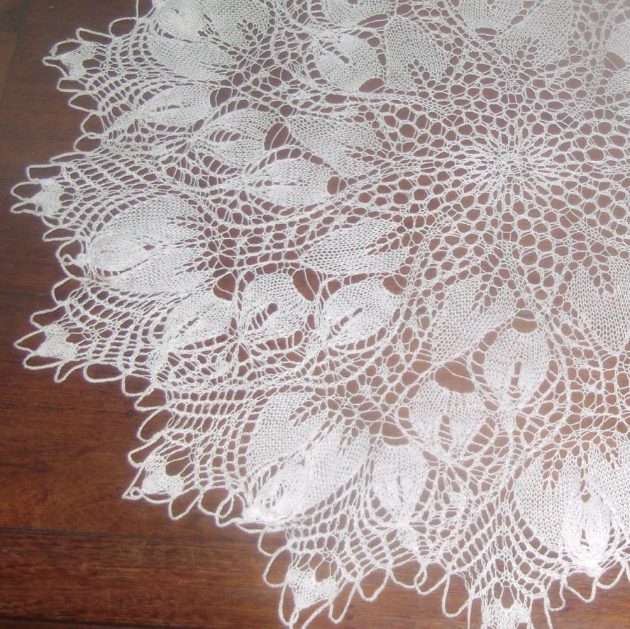 .......también hay algo en 5 agujas. Aquí no se ve muy bien , pero el centro de las flores queda levantadito cuando lo almidonamos.