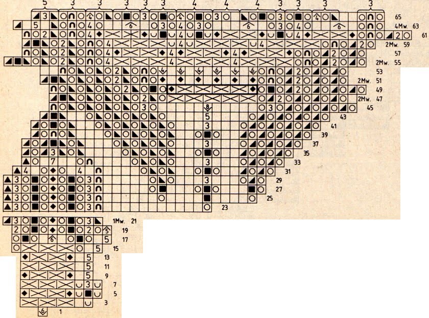 Para el centro de la flor trabajar en un anillo de hilo, 6 p.bajo, a ganchillo; en la segunda v., trabajar 12 p.b.,y cerrar la vuelta con 1 p. e. Con una de las agujas del juego , levantar la vaga posterior de cada 2º p.cerrado y repartirlos en 3 agujas. Luego según esquema gráfico, tejer 6 fases de muestra por v. cerrada. En la 50º v.cerrada., cerrar los 10 puntos enmarcados de la 49º v.cerr.; en la 51º v.cerr., tejer 1 p.der. retorcido, resp., en la vaga del º,3,4º6º, 8º y 10º p. cerr. Después de la 66 v.cerr., cerrar los puntos a ganchillo, intercalando 15 p. ced., respectivamente , entre los p. b.