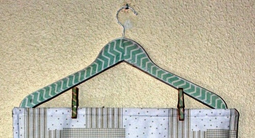 Como soporte, una percha de madera con papeles de scrap y dos pinzas a juego.