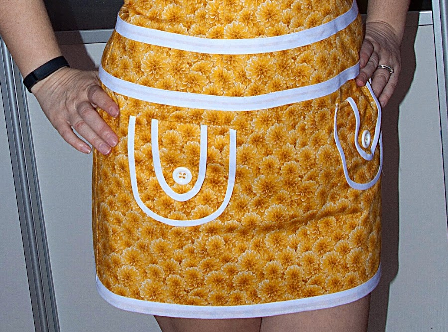 Una de mis compras fue este algodon estampado de flores en amarillo, amor a primera vista, nada mas verla mi idea fue un vestidito de verano sencillo, con un rollito muy vintage. El corte es recto, el cuello es rectangular y no lleva mangas, con bies blanco he decorado el cuello, las sisas, y la cadera a modo de cinturón, tambien le he puesto unos bolsillos redondeados con unas trabillas y un boton blanco, todo decorado tambien con bies blanco. El vestido es cortito, debo confesar que por que no tenia mas tela jejeje, pero es perfecto para ir a la playa o salir a pasear y tomar un cafecito en una terraza.