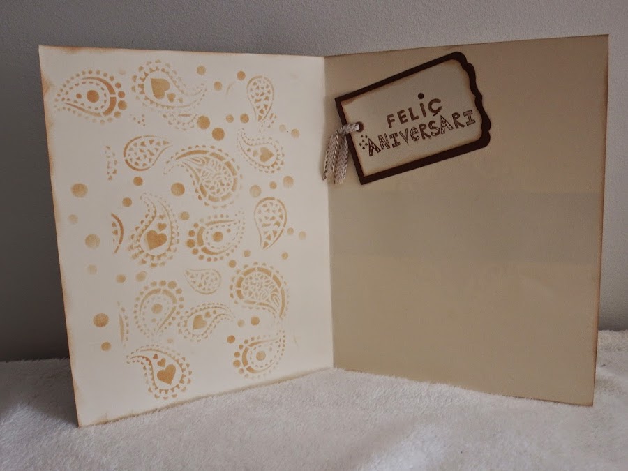 Com que erem una colla per signar, la vaig fer mida A4. La base es una cartolina mida a A3 , de color beig, doblada per la meitat. Els papers son de TIM HOLZT, i ni ha des dues col.leccions diferents. Les lletres i el número son de fusta i els vaig trobar a la Papereria Matec de Banyoles, i pintats amb tinta de la casa MEMENTO , color RICH COCOOA.