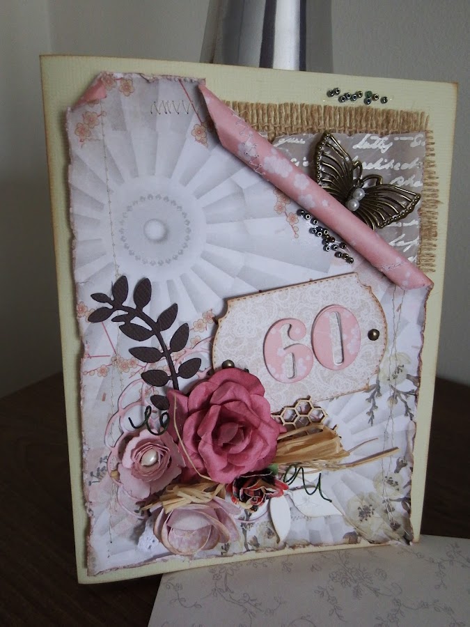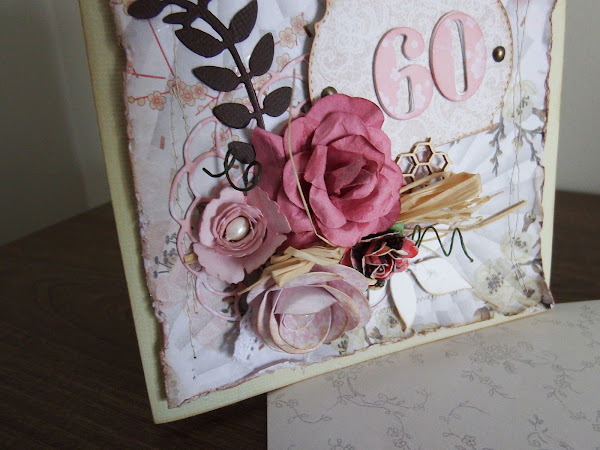 A la part inferior hi he fet un bouquet de diverse flors.Algunes ja comprades i daltres fetes amb troquels amb la BIG SHOT. Tant el 60 con letiqueta en que està posat estan fets amb troquels de la BIG. El nùmero primer lhe troquelat amb paper dacuarela de gramatge alt un parell de vegades i una altre amb el paper decorat i lhe enganxat amb cola. Així queda com un chipoard.