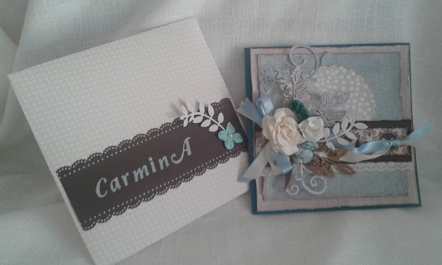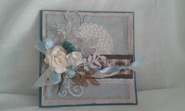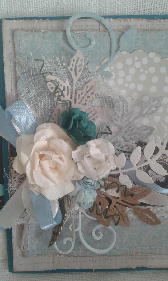 La combinació, blau,veig i marró sempre mha funcionat. Esta muntada sobre una cartolina amb textura . Tots el costats estant rasgats i entintats amb DISTRES , VINTAGE PHOTO.Cintes, puntes diferents troquels amb la big shot i unes flors , complementen la decoració