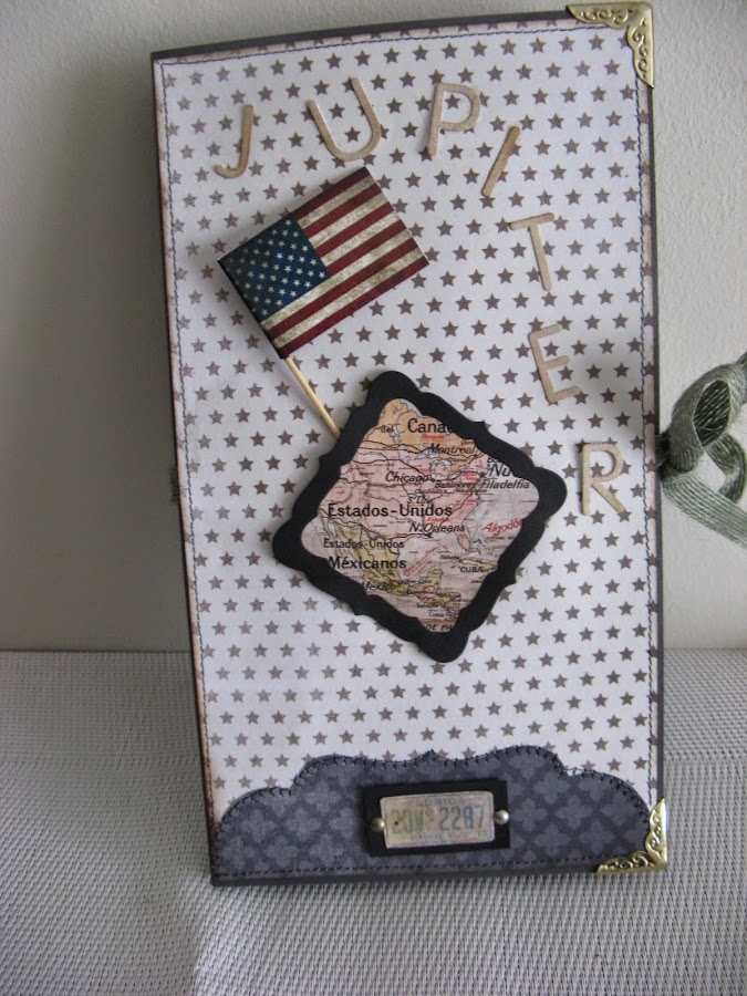 Tant la bandera com el mapa antic de florida; els vaig treure d"internet i els vaig imprimir sobre cartolina de color cru. La matrícula del cotxe pertany a una col.lecció de papers de TIM HOLTZ, la vaig posar sobre una cartolina negra rematada amb dos mini brads i amb una generosa capa de glossy.