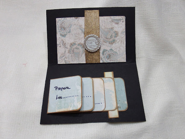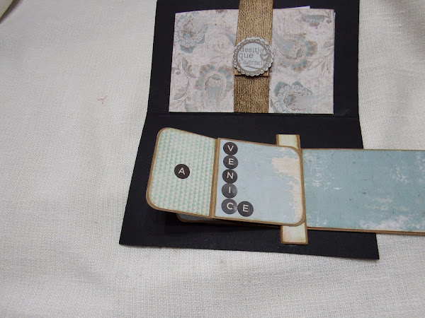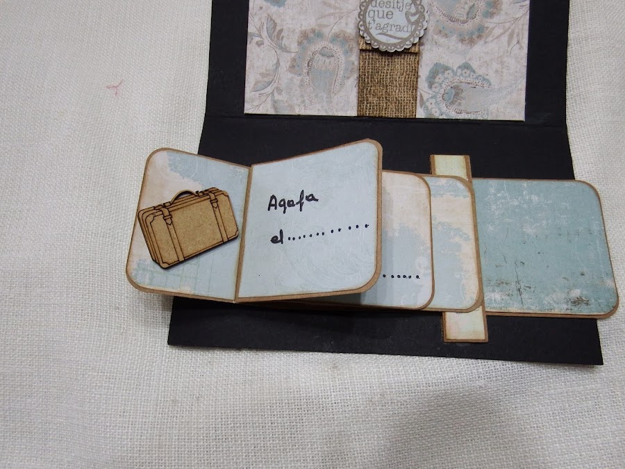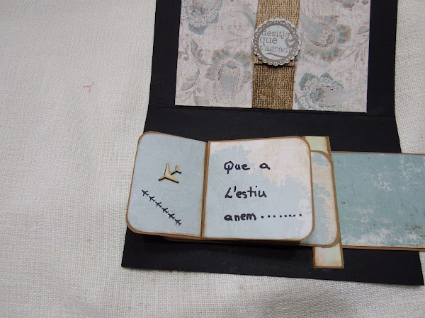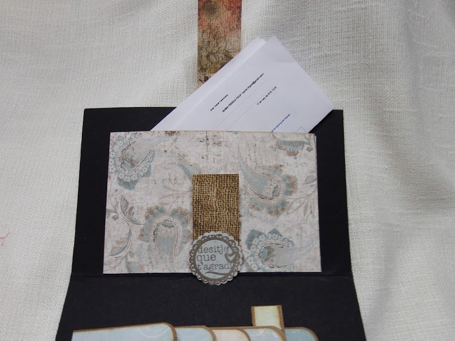 A la part de dintre, un sobre i una targeta en cascada, feta amb cartolina craf i decorada amb papers.