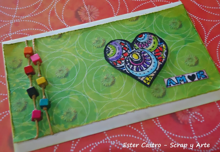 Sobre un recorte de la mini lámina elegida para decorar nuestra tarjeta le realizamos un desgastado por los bordes luego pegamos los hilo o cordón con las cuentas a un costado de ella y del otro lado colocamos el Corazón con volumen y la palabra Amor y la aplicamos sobre la tapa de la tarjeta