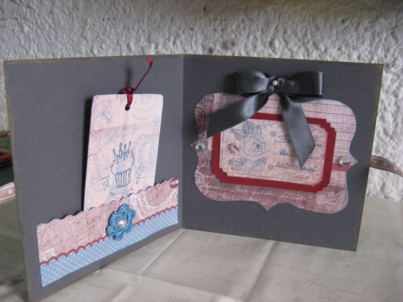 A la parte delantera una cartulina embosada, gentileza de mi amiga Yolanda, puesta sobre unpapel recortado con unas tijeras de ondas, una flor de papel hecha manualmente, con un botos en el centro por adorno, un mini tag que va sobre una cinta a cuadritos que lleva un part de brillantes a modo de adorno en cada lado y una cinta que da la vuelta a toda la tarjeta y sirve para cerrarla.