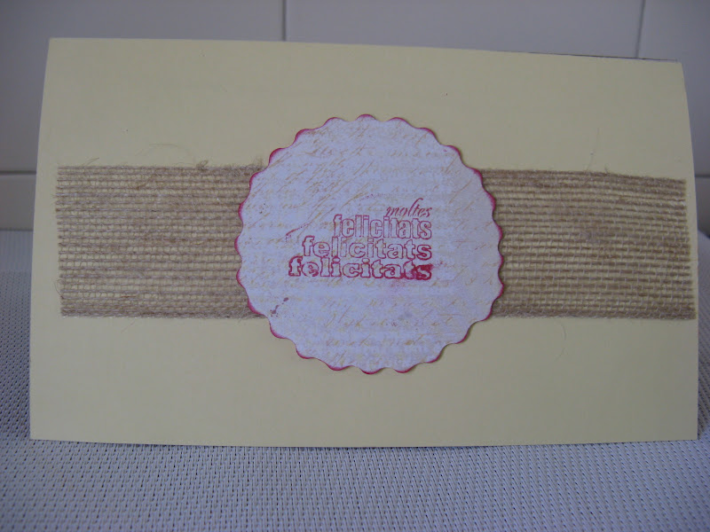 Como habreis visto las tarjetas me gusta decorarles todos sus lados, asi que a la parte trasera otro troz de cinta de arpillera y un circullo recortado con unas tijeras de ondas. Un sello de Muchas felicidades termina el conjunto.