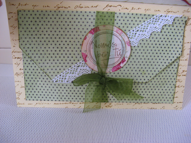 A l"altre costat com que hi tenian que posar-hi el regal, hi vaig fer una butxaca, amb una punteta i una cinta d"organza per poder tancar la butxaca, completa la decoració un parell de cercles tambe tallats amb la big.