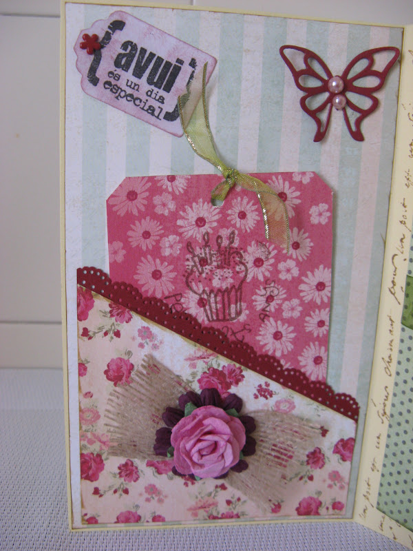 Els papers que he fet servir son de MY MIND"S EYE , el arabesc, la papellona i la flor granate de felpa estan troquelats amb la big , les altres flors son fetes amb cintes. les lletres son d"un abecedari adhesiu.