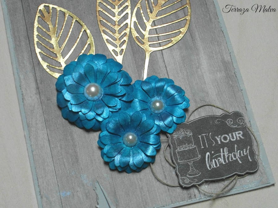 En mis tarjetas no suelo utilizar habitualmente las flores y no se bien porqué, pues quedan realmente bonitas. Para esta tarjeta me he inspirado en la foto que propone este mes La Pareja Creativa y he combinado flores en un tono turquesa vibrante con troquelados de hojas en dorado sobre un papel de Mel McCarthy que imita listones de madera.