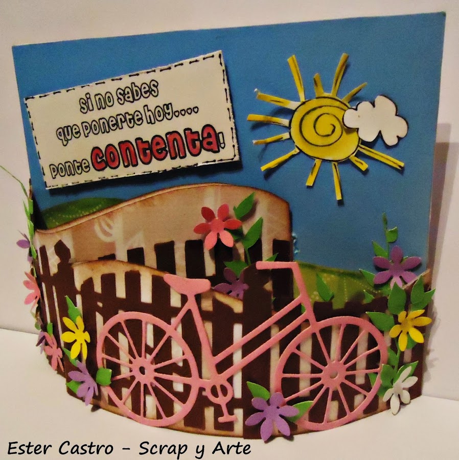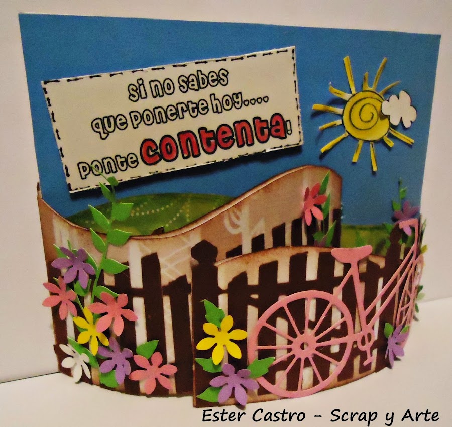 Mi tarjeta es una combinación de diferentes herramientas de trabajos, la base de la misma esta confeccionada a mano, la decoración (tranquera y ramas de hojas) con la Silhouette Cameo,, Bicicleta cortada con la Big Shot, flores con un mini punch, cartel, sol y perrito son digis los cuales los pinte con acuarelas.