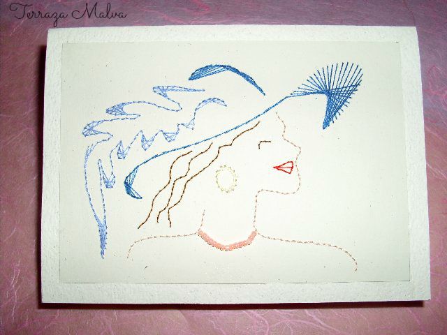 Esta tarjeta está bordada con hilo de algodón. Como detalle he añadido una serie de abalorios colgados del cuello en hilera que parecen el collar de la dama en cuestión.