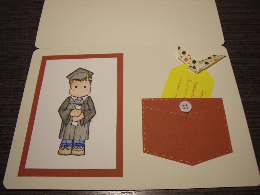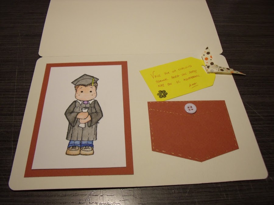 Al abrir la tarjeta lo que podemos ver es esto, es un sello de magnolia que me envío Chunli (Esther) y que he coloreado con pinceles acuarelables. Después le he hecho un bolsillo, al que he añadido un botón y dentro le he puesto una etiqueta dónde está escrito en que consiste el regalo, y le he puesto un sello en forma de flor en una esquina, he intentado añadir una cinta estampada para darle más vida.